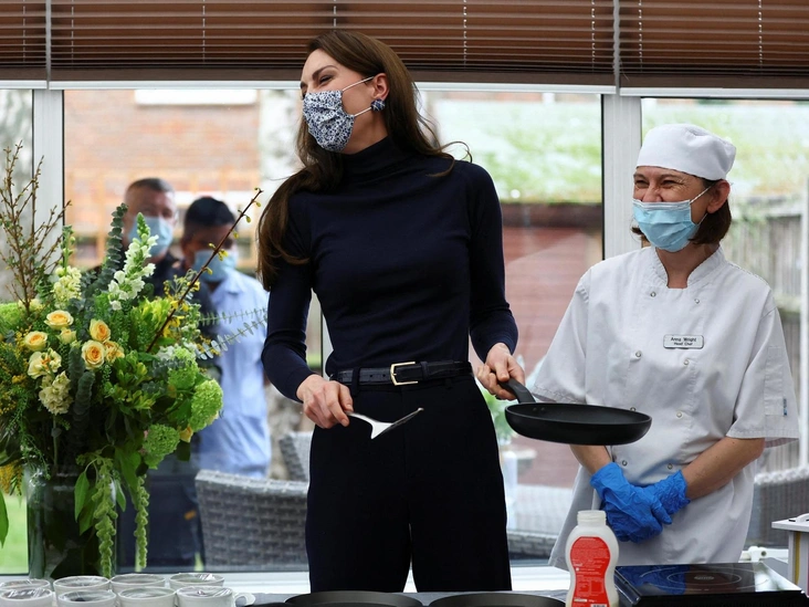 Кэтрин, одетая в темно-синюю водолазку, темные брюки и маску, неловко смеялась, стоя за плитой, пока на нее смотрели несколько репортеров, сотрудников и постояльцев беркширского дома престарелых. Пытаясь переместить смесь лопаткой, она попросила у одного из поваров совета, чтобы убедиться, что сейчас подходящее время для переворачивания блина. Когда принцессе сказали подождать, она пошутила: «Вот здесь я ошибаюсь, я всегда стараюсь перевернуть их слишком быстро!» Через несколько секунд Кейт, как показалось обозревателям, с трудом подняла края формирующегося блина, который прилипал к сковороде.