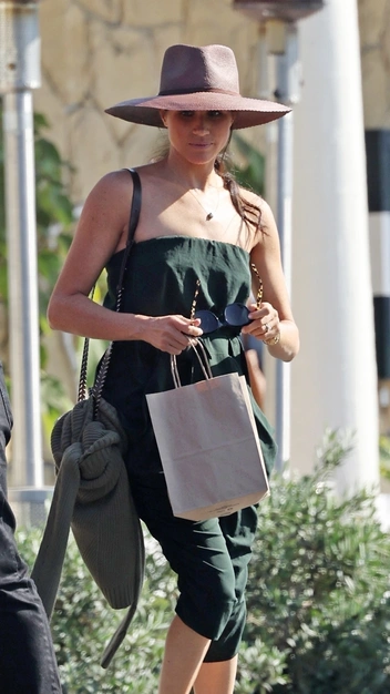 На прошлой неделе Меган и ее подруга совершали покупки в кулинарном бутике Pierre La Fond в Монтесито (где сейчас живет Сассекская с принцем Гарри и детьми). Герцогиня была одета в темно-зеленый комбинезон без бретелек от Malia Mills, который она дополнила оливковым джемпером, широкополой шляпой от Cuyana, большими солнцезащитными очками и открытыми сандалиями.