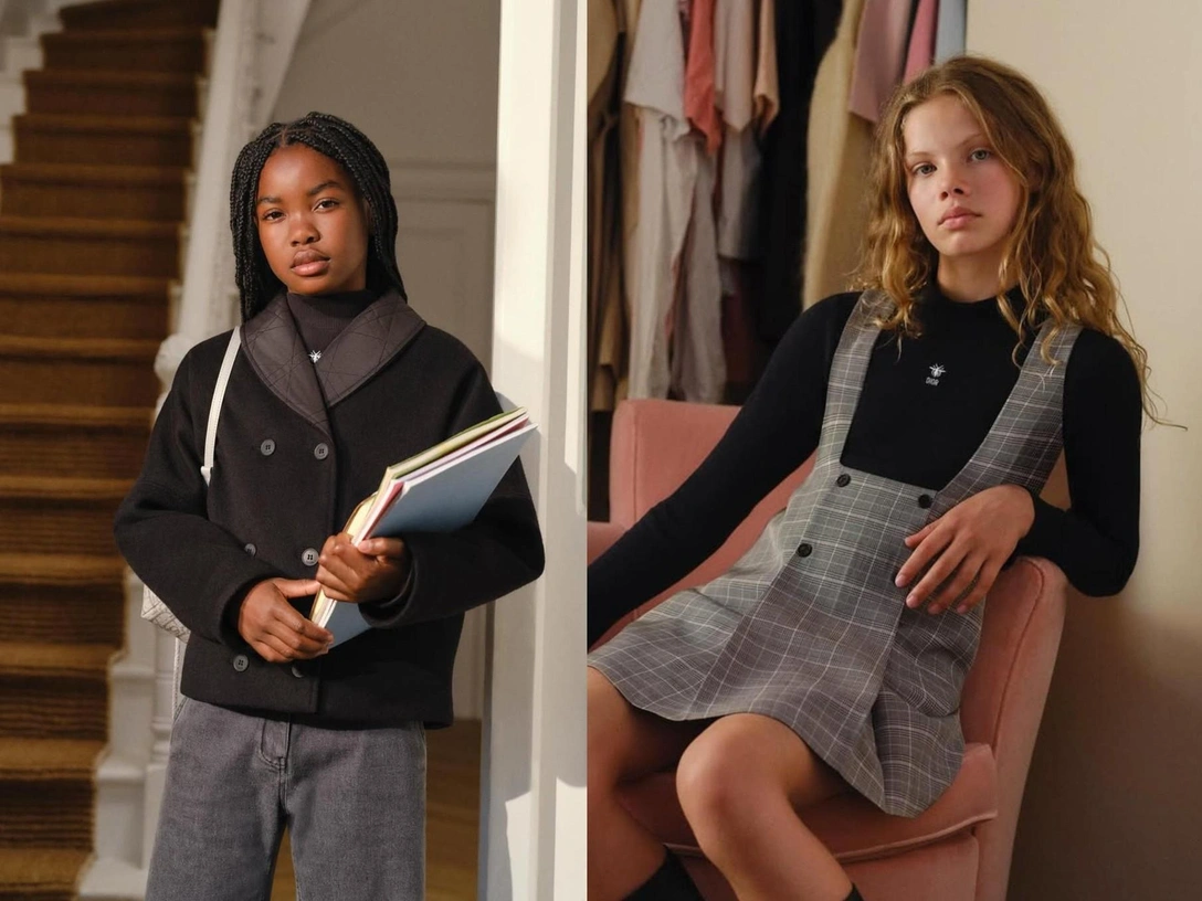 Все наряды, показанные Dior, предназначены для походов на учебу и повседневной жизни самых маленьких клиентов Дома. Серые сарафаны из классической формы в ней оказываются рядом со структурированными пальто, трикотажными свитерами и кардиганами. Некоторые изделия украшает культовая вышивка «Diorling», которую бренд возродил в этом году. Этот кампейн значительно отличается от остальных, потому что дети в нем показаны очень реалистично — без лишних улыбок и смеха, с присущей подросткам безэмоциональностью и стремлением казаться чуть взрослее.