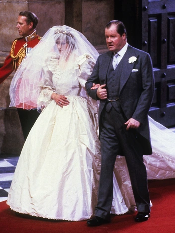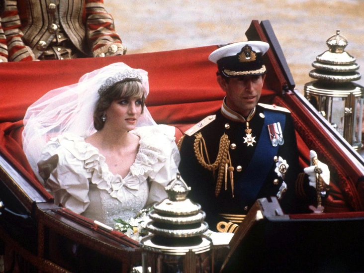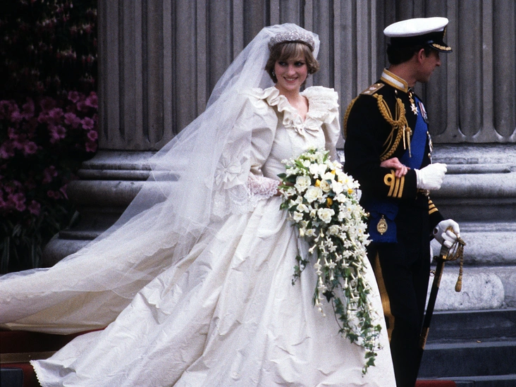 «Замысловатое платье невесты из тафты цвета слоновой кости было дополнено с кружевной вуалью длиной не менее 14 метров вместе с фамильной тиарой восемнадцатого века, а ее шелковые свадебные туфли были расшиты 542 пайетками и 132 жемчужинами — каблуки были намеренно низкими, чтобы не отодвинуть на задний план жениха: Диана, чей рост был равен 178 сантиметрам, была точно такого же роста, как Чарльз», — писал Роберт Лейси. О том, что принц и принцесса Уэльские были одного роста, писали многие историки (читайте также: Высокое положение: какого роста члены британской королевской семьи).