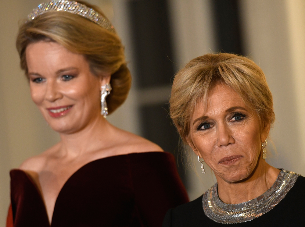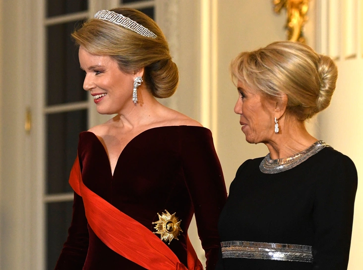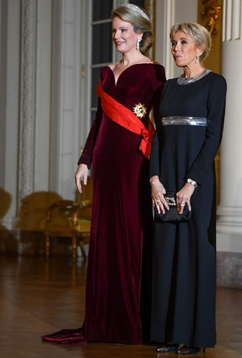 По всем канонам, вечером король Филипп давал в честь гостей государственный банкет во дворце Лакен, для которого первая леди Франции и королева Бельгии вновь обратились к «привычным» для себя образам. Мадам Макрон уже не в первый раз выбирает для подобных случаев однотонное платье в пол с контрастными вставками цвета металлик (в таком же красном Брижит появлялась в Китае, например), тогда как Ее Величество обращается к классике: платье с открытыми плечами и с акцентом на декольте и, разумеется, великолепная тиара в греческом стиле, прекрасно координирующая с замысловатыми бриллиантовыми серьгами.