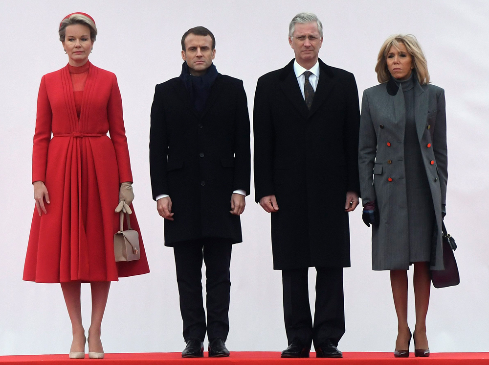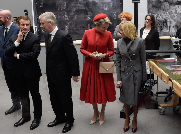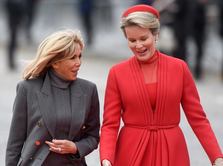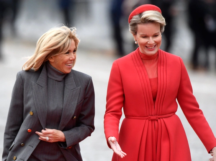 Примечательно также, что первая леди Франции предпочла отказаться от любимой длины мини (что она делает крайне редко: «Как Брижит Макрон сняла табу на мини-юбки и стала новой иконой стиля Франции») и прибыла на встречу в сером платье и пальто Louis Vuitton длиной до колена, дополнив образ лодочками и сумкой оттенка бордо. Что же до Матильды, то Ее Величество вновь продемонстрировала свой фирменный и весьма консервативный подход к королевской моде, появившись в ярко-красном пальто, шляпке в тон и нюдовых лодочках.