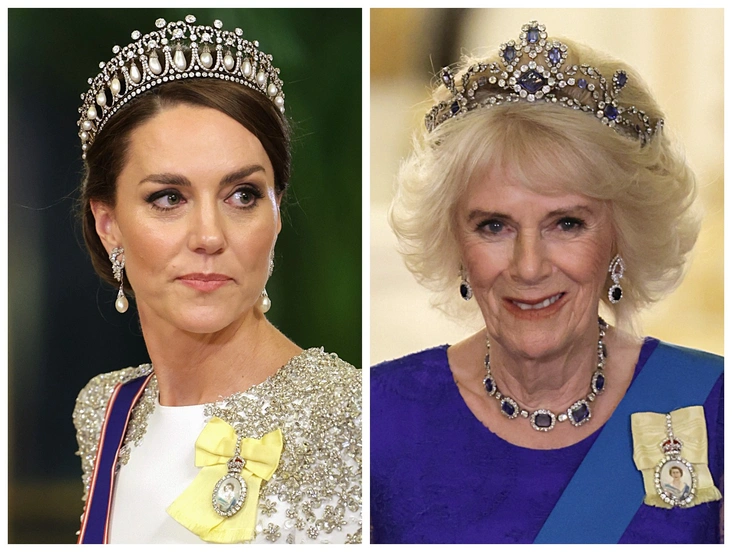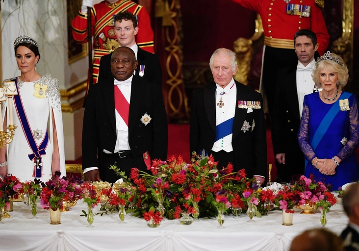 Ккоролева-консорт и принцесса Уэльская вчера были замечены в особых брошах на государственном банкете в Букингемском дворце. Обе надели орден королевской семьи Елизаветы II на торжественное мероприятие во вторник вечером, когда Карл III устроил прием по случаю государственного визита президента ЮАР Сирила Рамафосы. Это первый официальный банкет во дворце при новом монархе.