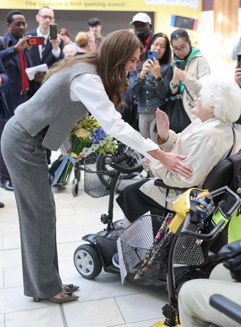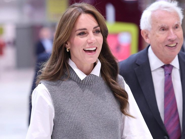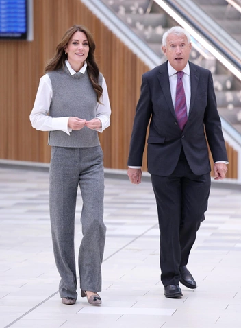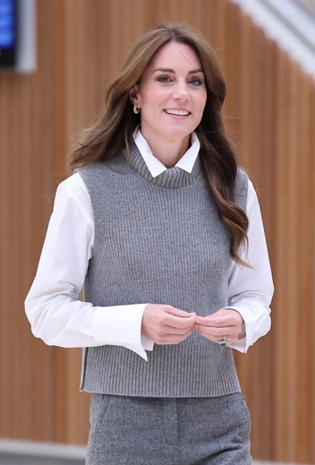 Так, Кэтрин посетила общественный центр в Брэкнелле в серых брюках и трикотажном жилете поверх белой рубашки с широкими рукавами. Из украшений на принцессе были только серьги с небольшими жемчужинами.
