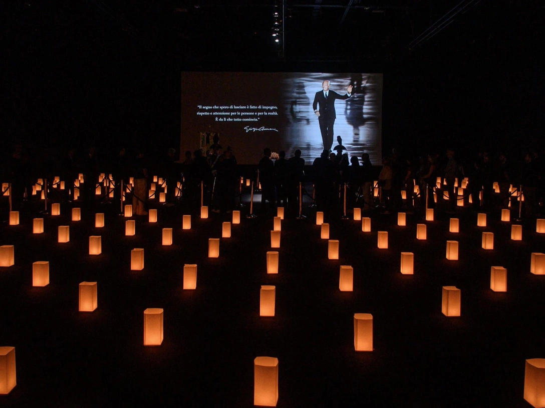 Прощание проходит в пространстве Armani Teatro, где сам Джорджо регулярно демонстрировал свои коллекции. Внутри все соответствует печальному событию: ряд свечей в бумажных пакетах создает мерцающий свет, а на заднем плане тихо играет фортепианная музыка итальянского композитора Людовико Эйнауди. Закрытый гроб украшают шикарные белые розы. На стены также проецируется фотография дизайнера с надписью: «След, который я надеюсь оставить, — это преданность делу, уважение и искренняя забота о людях и о реальности. Именно с этого все и начинается» (читайте также: Умер модельер Джорджо Армани).