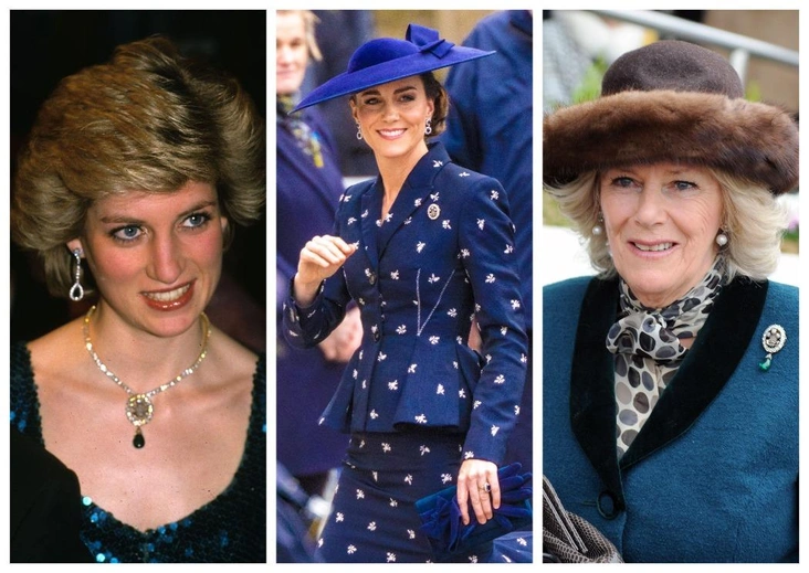 Принцесса Диана предпочитала носить брошь с гербом принца Уэльского она шее как кулон на золотом основании с бриллиантами. Она не убирала каплевидную подвеску-кабошон, которой не было на броши, когда Кейт надела ее на службу.