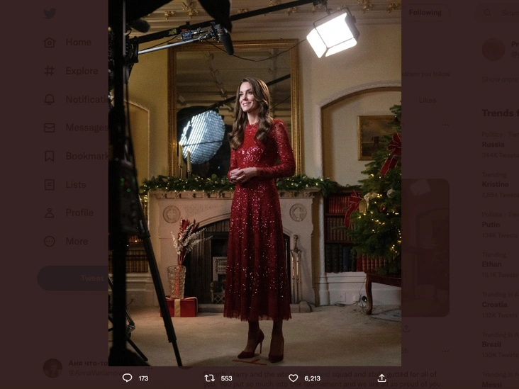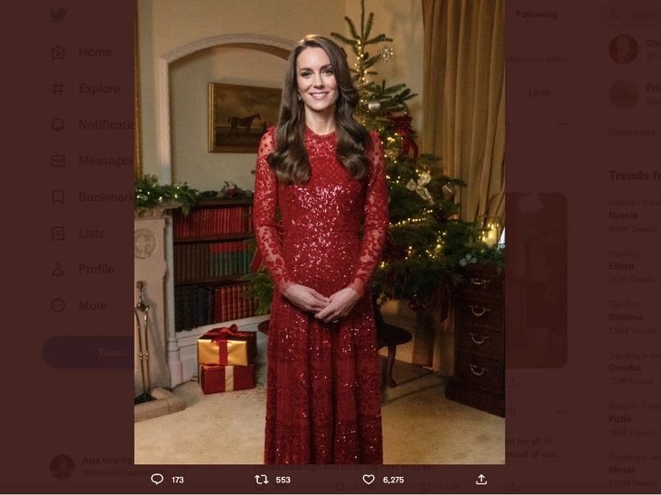 На фотографиях Кейт позирует на фоне праздничной ели и подарков в приталенном сияющем платье красного цвета. Поклонники отметили красноречивую, на их взгляд, позу герцогини — она сложила руки в районе живота, который на фото выглядит чуть округлившимся. Новые снимки принцессы Уэльской тут же спровоцировали очередную волну слухов о ее четвертой беременности.