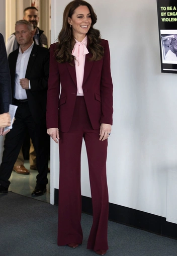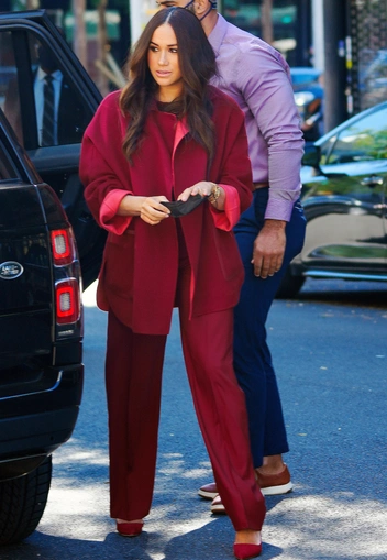 В той же поездке Меган выбрала расслабленный брючный костюм темно-малинового оттенка. К слову, цвет маджента уже был объявлен главным для 2023 года, так что тренд на эту цветовую гамму будет только нарастать (читайте также: Главный цвет 2023 года: какой и как его носить). И Кейт тоже примерила брючный костюм похожего оттенка, прибыв в Америку. Впрочем, принцесса предпочла более облегающий и привычный силэут, чем ее невестка. Зато остроносые туфли в тон одежде — прием, любимый обеими титулованными особами.