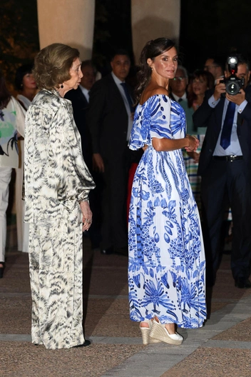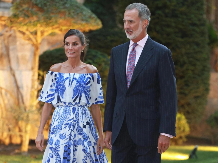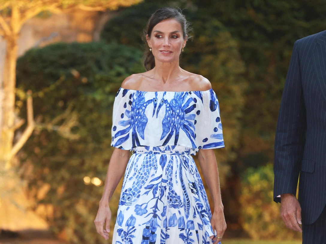 Но если на Меган это платье смотрится неудачно, то похожий наряд на королеве Летиции выглядит выигрышно. Королева Испании надела платье длины макси от Desigual x Stella Jean Ruffle стоимостью 189 евро для приема в Пальма-де-Майорке 3 августа 2023 года. Белое платье с синими животными и растительными принтами и открытыми плечами королева дополнила своей любимой обувью на танкетке белого цвета.