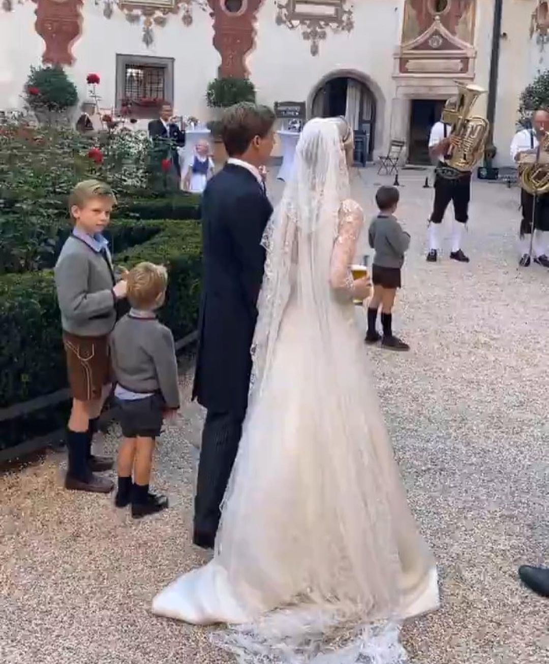 На невесте было белое платье, фата и тиара великой герцогини Марии Аделаиды Люксембургской с сапфиром в центре композиции. На церемонии также присутствовала дочь принца и эрцерцогини, малышка Виктория. Как и большинство присутствовавших на свадьбе, белокурая девочка была одета в трогательную вариацию национального костюма — белоснежную блузу с рукавами-фонариками, розовое платье и фартук цвета слоновой кости. Впрочем, родители невесты, эрцгерцог Карл Кристиан Австрийский и принцесса Мари-Астрид Люксембургская, были одеты во вполне современном (с королевской точки зрения) ключе — на эрцгерцоге был фрак, а на принцессе — длинное красное платье.