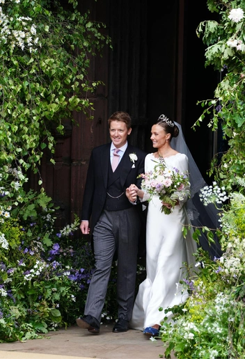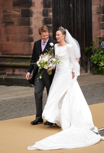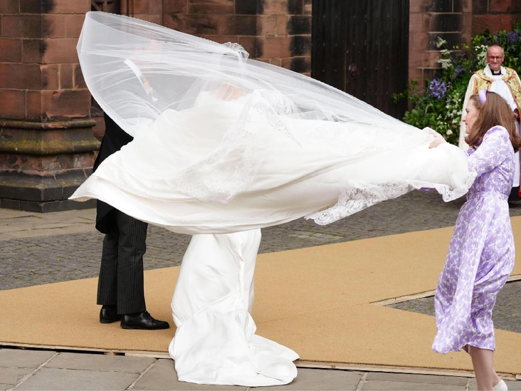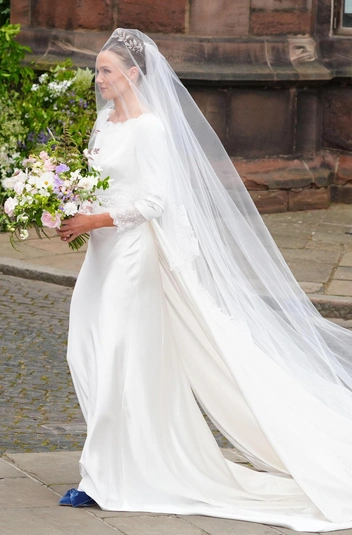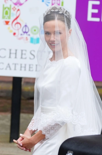 Спустя некоторое время после появления Хью Гровенора толпа встретила винтажный Bentley с его супругой Оливией Хенсон. Пара познакомилась несколько лет назад через общих друзей и встречалась до тех пор, пока Хью не сделал Оливии предложение в родовом поместье. Девушка появилась в платье с двухметровым шлейфом и бриллиантовой тиаре авторства Фаберже — подробнее написали тут (читайте также: Двухметровый шлейф и бриллиантовая тиара: как выглядела самая красивая невеста Британии — все детали свадебного образа Оливии Хенсон).