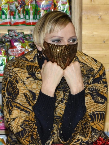 Также можно заметить изменения и в одежде княгини. На 42-летней монаршей особе был жакет в этническом стиле с броским желто-черным принтом, под которым скрывался черный свитер с люрексом. Комплект завершила маска бронзового оттенка — также с люрексом — и крупные золотистые серьги-завитки.
