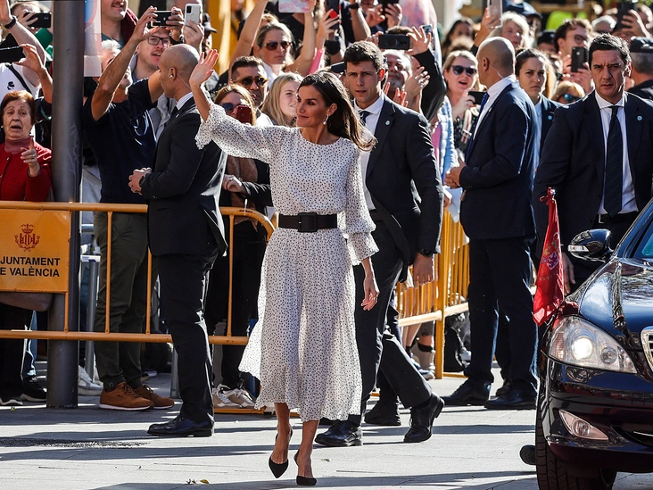 Королева Испании Летиция и ее супруг король Филипп VI появились на церемонии вручения научной премии Rei Jaume I в Валенсии. На королеве было летящее белое платье с черным поясом и одним из самых любимых принтов другой королевской особы, принцессы Уэльской.