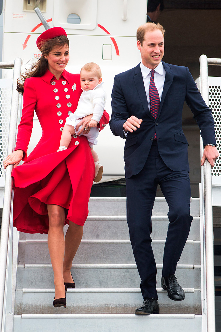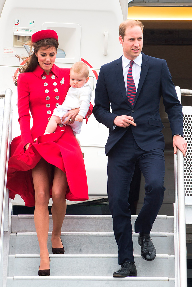 Кейт Миддлтон вышла на трап самолета в алом пальто Catherine Walker с крупными пуговицами, платье в тон и такого же цвета шляпке-таблетке Gina Foster. Ее верхнюю одежду украшала брошь в виде листа папоротника – символа Новой Зеландии. Герцогиня позаимствовала ее из коллекции Елизаветы II так же, как ранее брала ее свадебное колье. Трехнедельное турне королевской четы обещает изобиловать утонченными нарядами герцогини: недавно стало известно, что для поездки Кейт Миддлтон приобрела платье Ralph & Russo за 80 тыс. долларов. Это удивительно: известная своим бюджетным подходом к выбору одежды, Кейт в 2012 году потратила такую же сумму на весь свой гардероб. Принц Джордж был одет в кремовый джемпер, рубашку и объемные шорты. Общественность, увидевшая фото, возмутилась тем, что герцог и герцогиня одеты достаточно тепло, а сына нарядили в легкую одежду.