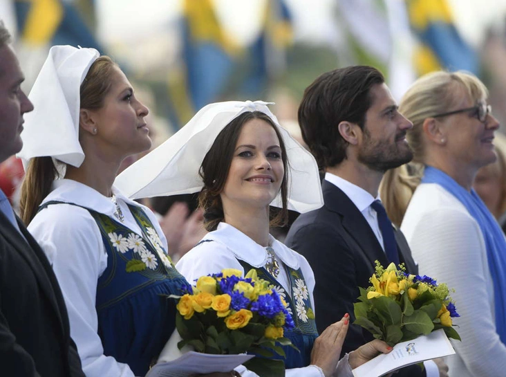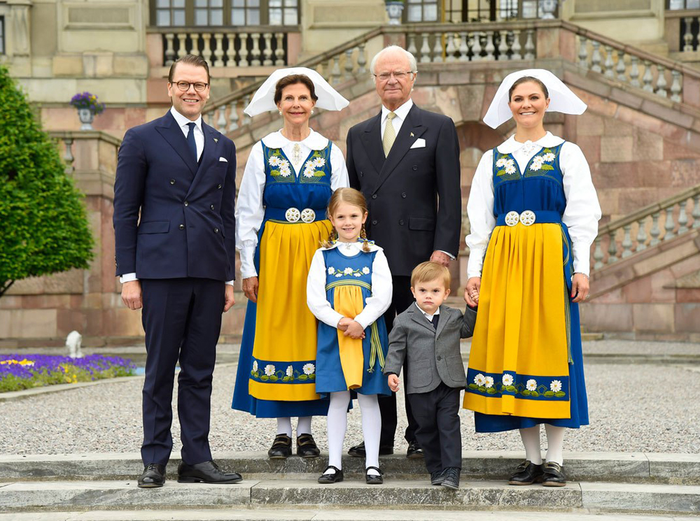 В среду королевская семья почти в полном составе отправилась в музей Скансен, где традиционно проходит церемония поднятия шведского флага, после чего дети в национальных костюмах преподносят королю и королеве цветы.