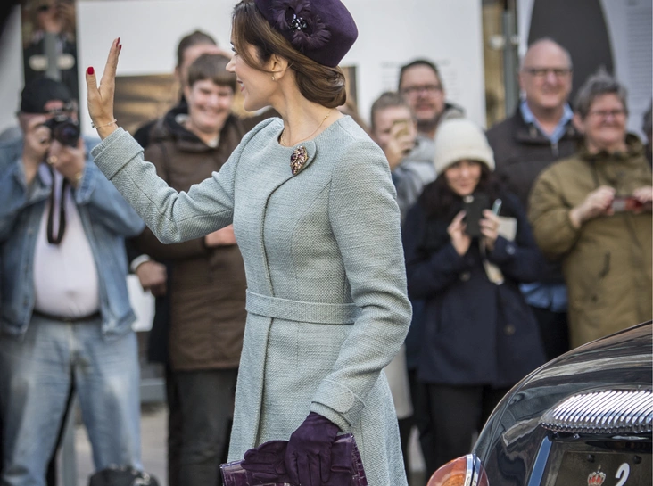 Мэри выбрала идеальный образ с точки зрения политического дресс-кода: элегантное твидовое пальто голубовато-серого цвета с внушительной бриллиантовой брошью на воротнике, балетки нюдового нюд и фиолетовую шляпку-таблетку с украшением в виде розы.