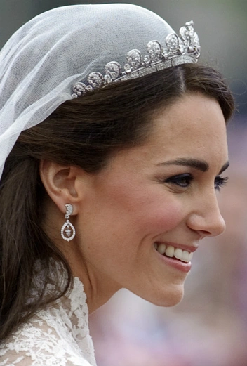Как правило, невесты, принадлежащие к аристократическим династиям идут к алтарю в фамильных тиарах своих семей. Именно так поступила леди Диана, выходившая за принца Уэльского в тиаре Спенсеров. У Кейт, происходившей из обычной семьи, такой возможности не было, и многие полагали, что она могла бы появиться в церкви в том же украшении, что и ее покойная свекровь. На самом деле выбранная Кэтрин модель Cartier из сокровищницы Елизаветы во многом похожа на тиару Спенсеров. Тем не менее, украшение из коллекции Ее Величества немного лаконичнее.