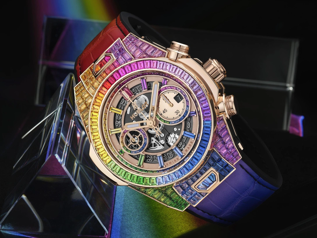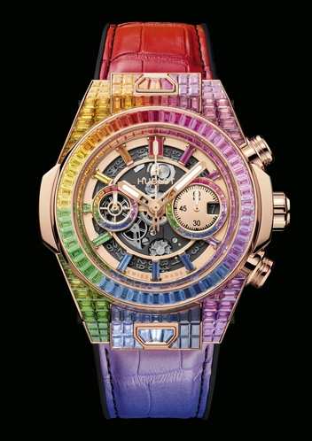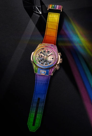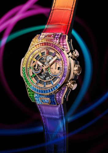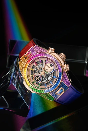 «После дождя всегда появляется радуга» — кажется, именно эта фраза должна стать главным девизом 2021-го после сложного прошедшего года. С не меньшим оптимизмом швейцарский бренд Hublot также выпускает новинку — часы Big Bang Unico Full Baguette King Gold Rainbow, которые представляют из себя настоящую радугу в виде ярких драгоценных камней на фоне 18-каратного розового золота. Переливы света напоминают настоящее природное явление: алый сливается с фуксией, становясь ультрафиолетовым, чуть-чуть синего Klein, бирюзового, затем небесного, зеленого, который становится мягче, меняется на яркий желтый цвет и переходит в теплый оранжевый.