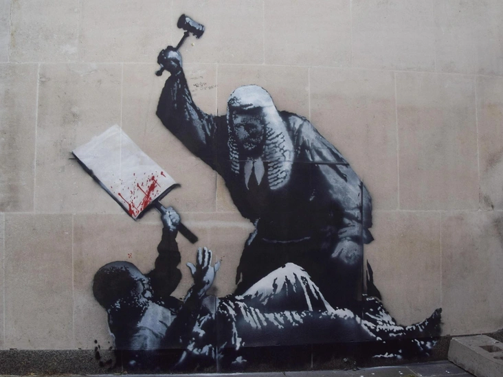 Обычно граффити Бэнкси быстро удаляются с глаз общественности, а многие политические деятели уверены, что художник — самый настоящий преступник и вандал. Последняя его работа появилась в сентябре прошлого года, но была вскоре стерта. На ней изображен судья, нападающий на протестующего с молотком, а сам Бэнкси назвал свой арт «Королевский суд».