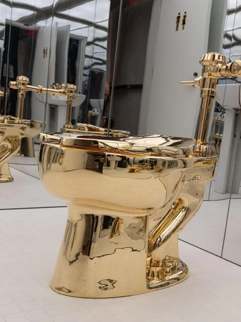 Каттелан объяснял, что его золотые унитазы — сатира на культ богатства. Он создал две аналогичных скульптуры еще в 2016 году. Одна выставлялась в Нью-Йорке, в Музее Гуггенхайма. А затем, во время выставки в британском Бленхеймском дворце, она была украдена. Виновных нашли спустя 6 лет, однако вернуть экспонат так и не удалось. Считается, что преступники разобрали его и переплавили.