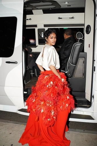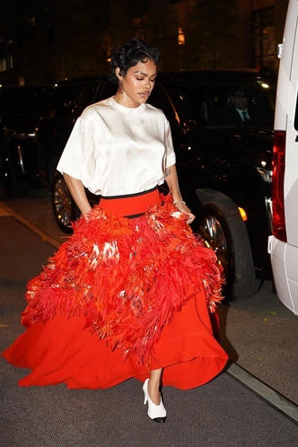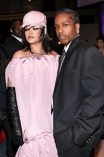 Как всегда украсть вечер удалось паре Рианны и A$AP Rocky. Певица Выбрала платье Balenciaga авторства Пьерпаоло Пиччоли с длинным шлейфом и объемным силуэтом. К нему в пару она надела кожаные черные перчатки и шляпку из перьев. Образ дополнило невероятное колье BVLGARI из коллекции High Jewelry из розового золота с кунцитами, танзанитами, рубеллитами и бриллиантами. А ее супруг позировал перед фотографами в костюме Chanel — напомним, что на днях его назначили амбассадором бренда.