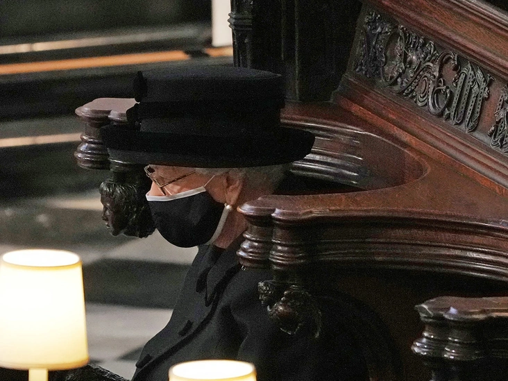 На похоронах Ее Величество сидела отдельно от других членов королевской семьи, выглядя строго и царственно, но одиноко. На ней был черный ансамбль, защитная маска в тон и бриллиантовая брошь на левом плече и неизменная сумка Launer в руках. Церемония проходила вдали от поля зрения широкой публики, и принять в ней участие смогли лишь 30 человек, как требуют предписания британского правительства, обусловленные пандемией. Тем не менее, присоединиться к прощанию с герцогом Эдинбургским можно было благодаря онлайн-трансляции. Соединенное Королевство почтило память покойного принца Филиппа минутой молчания в 15:00 по Гринвичу.