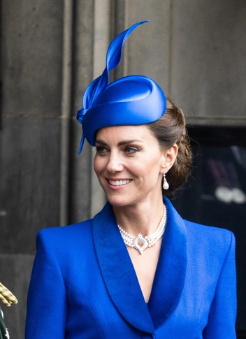 На торжественной церемонии коронации Карла III, прошедшей в соборе Святого Джайлса в Эдинбурге, Кейт Миддлтон появилась в стильном образе — синем платье-пальто Catherine Walker. Этот образ напомнил синее шерстяное крепкое пальто Кэтрин (тоже от Catherine Walker), в котором она дважды выходила в свет. Принцесса впервые дебютировала в этом наряде на службе по случаю Дня Содружества в 2022 году.