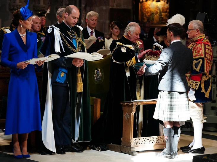 Принц Уильям, в свою очередь, был одет в форму Королевских ВВС и мантии шотландского ордена Чертополоха. На этой церемонии новому Королю были вручены драгоценности шотландской короны.