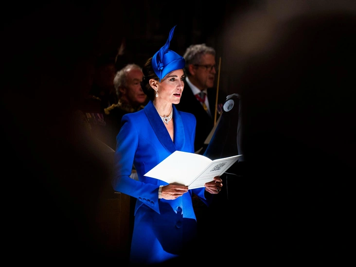 На торжественной церемонии коронации Карла III, прошедшей в соборе Святого Джайлса в Эдинбурге, Кейт Миддлтон появилась в стильном образе — синем платье-пальто Catherine Walker. Этот образ напомнил синее шерстяное крепкое пальто Кэтрин (тоже от Catherine Walker), в котором она дважды выходила в свет. Принцесса впервые дебютировала в этом наряде на службе по случаю Дня Содружества в 2022 году.