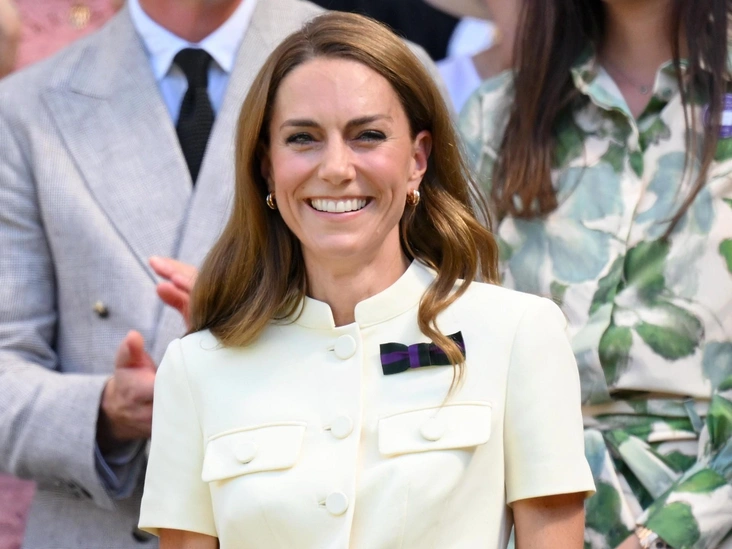 Кейт Миддлтон пришла, чтобы наблюдать за поединком спортсменок Аманды Анисимовой и Иги Свентек на Центральном корте Уимблдона из Королевской ложи. Для важного турнирного дня принцесса выбрала кремовый наряд, включающий блузку с высоким воротником и поясом, струящуюся юбку и сумку Anya Hindmarch Tote, дополнив образ элегантными крашениями. Она также добавила к своему наряду «Уимблдонский бант», выполненный в официальных цветах Всеанглийского клуба лаун-тенниса и крокета — фиолетовом и зеленом.