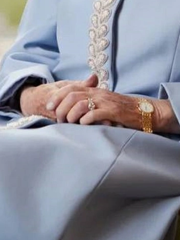 На официальном снимке британская королева сидит у окна замка, из которого видны очертания Круглой башни и статуи Карла II, в летнем пальто, дополненном несколькими характерными для ее стиля украшениями. Конечно же, на Елизавете, как и всегда, было жемчужное ожерелье — с нитями жемчуга в один или несколько рядов монарх практически не расстается (читайте также: Какое украшение Елизавета II носит практически постоянно (но вы не замечали)). Кроме того, обозреватели заметили на запястье Ее Величества золотые часы. Это модель Ladies’ Calatrava марки Patek Philippe образца 1990-х годов.