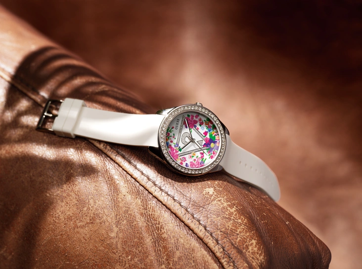 Идеальный аксессуар для романтичных натур: «цветущий» циферблат – разнообразие ярких розовых и лавандовых цветов, конечно же, олицетворяет скорое приближение весны! – с непременным фирменным логотипом в центре окружен серебряным корпусом, который обхватывает текстильный белый ремешок.