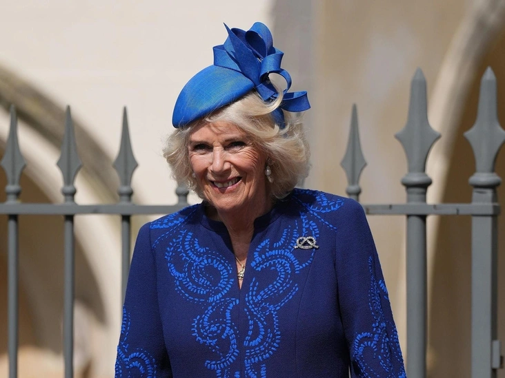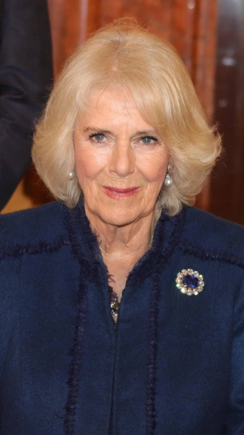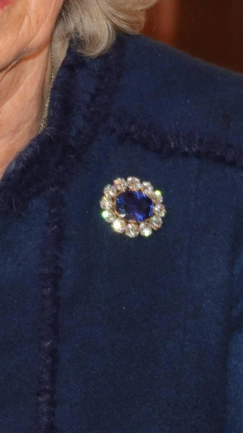 Для этой встречи королева-консорт Камилла выбрала одно из своих любимых платьев-пальто темно-синего цвета от Anna Valentine и черную кожаную сумочку от Chanel. Дополнила свой образ королева-консорт примечательной брошью с бриллиантами и сапфирами, которая ранее принадлежала королеве Елизавете II (и была одним из ее любимых украшений). Интересно, что это первый раз, когда Камилла появляется на публике с этой культовой драгоценностью (читайте также: Снежная королева: самый роскошный вечерний образ Камиллы в истории (и милое послание Елизавете II)).