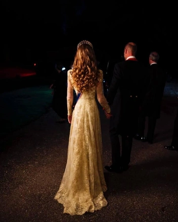В прошедший вечер принцесса Уэльская блистала в кутюрном платье британского дизайнера Филиппы Лепли. Ее шелковый наряд украшала вышивка из золотых нитей, а верх наряда, как и его рукава, были выполнены из полупрозрачной ткани. В дополнение ко всему принцесса также выбрала серьги покойной королевы Елизаветы II и королевские семейные ордена.