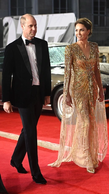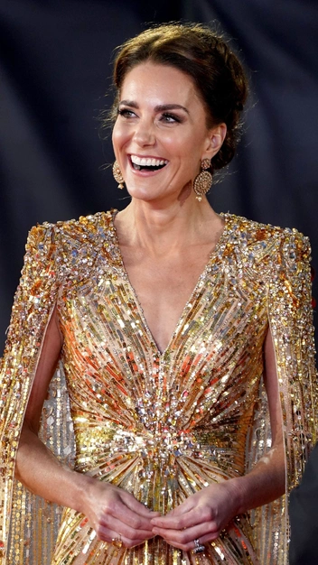 В сентябре 2021 года герцогиня Кэтрин приятно ошеломила поклонников своим образом на лондонской премьере фильма о Джеймсе Бонде «Не время умирать». На принцессе Уэльской было сияющее золотистое платье от Jenny Packham с V-образным вырезом, структурированными плечами и накидкой-кейпом. Кейт дополнила наряд крупными золотыми серьгами O’NITAA и парой блестящих туфель в тон от Aquazzura.