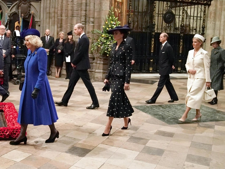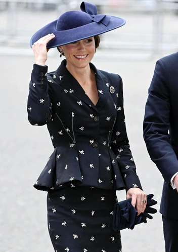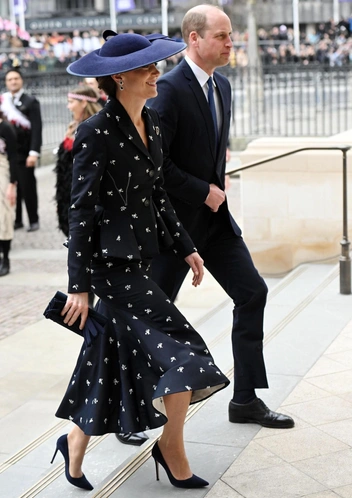 41-летняя принцесса Уэльская появилась в темно-синем костюме Erdem с мелким цветочным принтом за 3000 фунтов стерлингов, остроносых темно-синих лодочках Gianvitto Rossi, лаконичной шляпе с бантом и бриллиантовой броши Prince of Wales Feathers, которая ранее принадлежала принцу Чарльзу, пока он был принцем Уэльским. Кроме того, Кэтрин выбрала пару двухъярусных серег с сапфирами в окружении бриллиантов, которые ранее принадлежали ее предшественнице, принцессе Диане.
