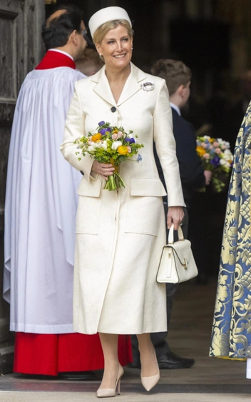 Новоиспеченная герцогиня Эдинбургская тоже не отставала от других королевских дам и выбрала эффектный ансамбль для церковной службы. 58-летняя Софи в очередной раз подтвердила свой статус главной иконы стиля королевской семьи, блеснув в текстурированном платье-пальто кремового оттенка Proenza Schouler за 2535 фунтов стерлингов и шляпе-таблетке в тон Jane Taylor за 990 фунтов стерлингов с эффектным черным бантом сзади. В руках у герцогини была сумка Valextra за 3250 фунтов стерлингов, а на груди красовалась крупная агатовая брошь.