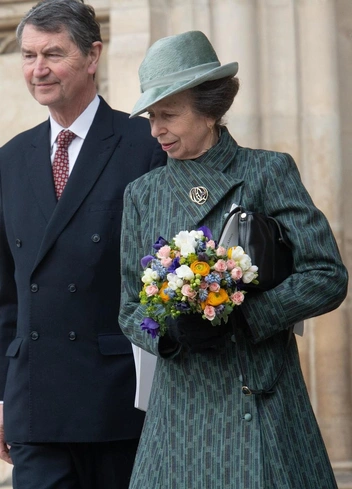 Принцесса Анна, в отличие от других представительниц монаршей династии, выбрала более теплый наряд, предпочтя обычное пальто общепринятому платью-пальто, а сапоги — лодочкам. На ней была компактная шляпа-федора нежного мятного оттенка. Как и другие титулованные леди, королевская принцесса вышла из аббатства с букетом из весенних цветов в руках.