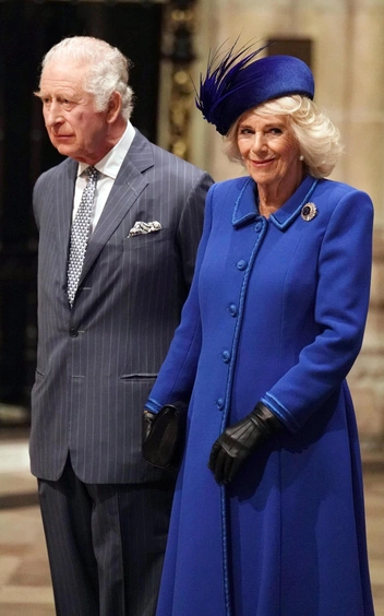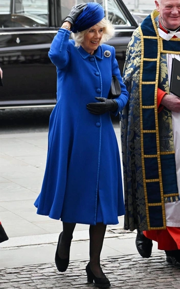 75-летняя королева-консорт прибыла в аббатство в синем платье-пальто Fiona Clare, украшенном одной из сапфирово-бриллиантовых брошей покойной королевы, и круглой шляпке Philip Treacy. Образ Ее Величества обозреватели посчитали скромным, но интересным за счет яркого оттенка, которые так любила ее покойная теща.