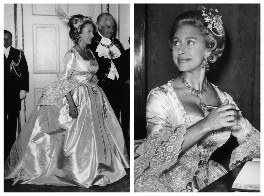 Бальное платье было создано специально для георгианского бала — благотворительного мероприятия в поддержку Friends of St. John's в Mansion House. Автором дизайна стал театральный дизайнер Оливер Мессель, чьими трудами Ее Высочество, судя по всему, восторгалась с ранней юности. А исполнил работу костюмер Монти Берман. Кстати, Мессель и был тем, кто познакомил Маргарет с ее будущим мужем Энтони Армстрог-Джонсом — тот приходился ему племянником. Так театральный художник породнился с Виндзорами.
