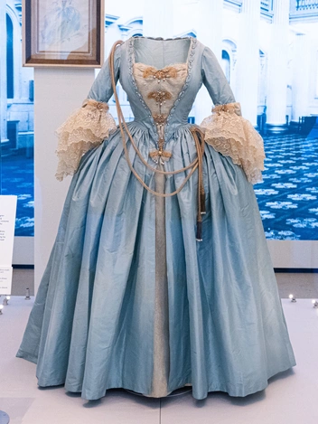 «Все, кто видел это платье, влюбились в него, — говорит Мэтью Стори. — Это роскошный бирюзовый шелк, затем слои золотой парчи и газа, золотая тесьма, банты, вышивка из бисера. Это типичный Мессель. Он создал невероятное. Что отличает его от других, так это сочетание материалов, от парчи до шелка, и всех украшений».