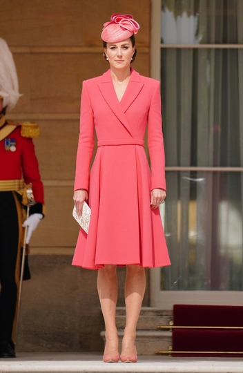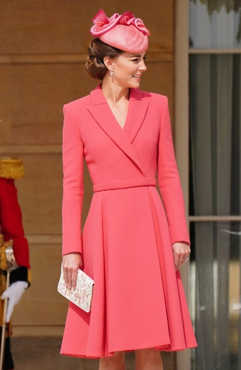 Для первой с 2019 года вечеринки в саду Кейт Миддлтон решила надеть самую яркую одежду — правда, здесь и скрывалась главная модная опасность. Для выхода герцогиня Кембриджская выбрала коралловое платье-пальто с юбкой А-силуэта от Emilia Wickstead (в ее гардеробе есть такое же, только пудрово-голубого цвета), а также туфли на каблуке Emmy London в тон (читайте также: Было/стало: как дизайнеры перешивают свои наряды ради Кейт Миддлтон). Она завершила образ винтажным клатчем и фасинатором от Jane Taylor. Шляпа тоже уже давно знакома ее фанатам: в 2017 году Кейт носила ее на Trooping the Color. Наряд пришелся по душе далеко не всем модным экспертам: многие посчитали, что цвет платья сливается с тоном кожи герцогини, что создает странную иллюзию в лучах солнца.