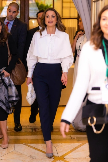 В мае на Глобальной конференции Института Милкена королева Рания также покорила поклонников своим выбором наряда. Хотя обычно для вечерних мероприятий правительница Иордании предпочитает длинные платья, этот вечер стал исключением в ее модных правилах. Она появилась в белоснежных брюках и укороченном блейзера, который дополнила майкой и элегантными туфлями на шпильке. Акцент в светлый образ внесла ее маникюрная новинка: молочный омбре-френч на квадратных ногтях.
