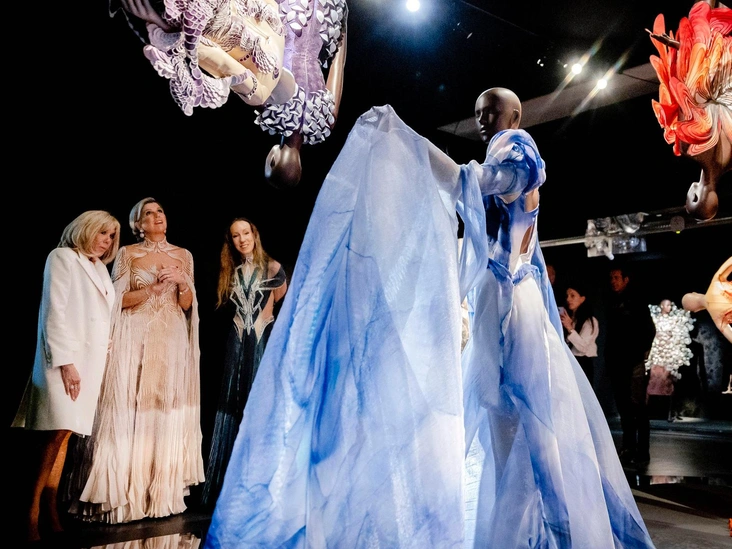 Поклонники королевы похвалили Максиму за смелость, правда были и те, кто подчеркнул, что наряд Ее Величества слишком отличался от дресс-кода остальных (читайте также: Стильная Максима: 5 модных правил королевы Нидерландов). Первая леди Франции Брижит Макрон прибыла в более традиционном образе от Louis Vuitton — белом пальто, прямом платье выше колена, в черных кожаных туфлях и с шарфом с логотипами. Единственной, кто тоже прибыл в вечернем платье, была сама Айрис Ван Херпен — девушка выбрала синий наряд своего авторства с разрезами.