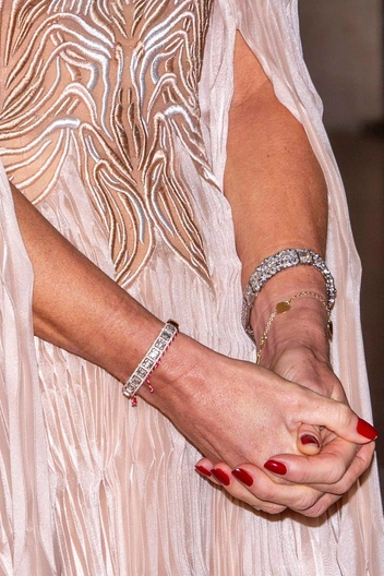 Не обошлось и без крупных украшений: Максима выбрала бриллиантовые серьги, браслет из платины и бриллиантов, и из желтого золота, тоже с бриллиантами. Макияж тоже был ярким: королева подчеркнула губы ярко-красной помадой и сделала смоки айс с коричневыми и черными тенями (читайте также: «Стеклянные» smoky eyes: как повторить самый модный макияж этой зимы).