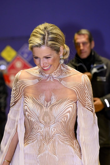 Так, королева Нидерландов посетила выставку голландской художницы Айрис Ван Херпен. Максима специально ради этого приехала в Париж на несколько дней. Королева поддержала дизайнера из своей страны еще и выбором наряда — на ней было бежево-золотистое платье авторства Ван Херпен. Отдельное внимание было к необычному верху платья — модельер всегда создает неординарные вещи, которые больше похожи на инопланетные наряды. Низ платья и рукава были из плиссированной бежевой ткани, а дополнил образ золотистый клатч и туфли на высоком каблуке.