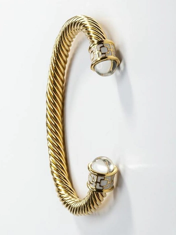 Описание продукта гласит: «Аквамариново-золотой браслет Halcyon Days Maya перенесет вас в спокойные голубые воды Карибского моря. Браслет Maya сделан из гибкой проволоки, которую можно аккуратно сжать, чтобы она соответствовала запястью любого размера. Изготовленный из латуни и покрытый блестящим 18-каратным золотом, каждый браслет имеет изогнутый силуэт произвольной формы и украшен стеклянными кабошонами цвета морской волны. Носите его отдельно в качестве эффектного предмета гардероба или комбинируйте с тремя или четырьмя другими предметами из коллекции Halcyon Days Maya, чтобы создать многослойный образ, который будет одновременно элегантным и роскошным». Halcyon Days может похвастаться богатой историей отношений с королевской семьей: это одно из 14 предприятий, получивших все три королевских ордера, и единственный поставщик предметов искусства для королевской семьи.
