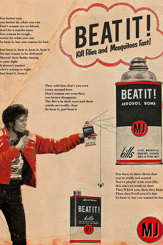 Дэвид Рэдон обыграл портреты многих исполнителей разных направлений: Эминем (Eminem) рекламирует сигареты «The way i am», Майкл Джексон (Michael Jackson) уничтожает москитов при помощи спрея «Beat it», поющая для «Малефисенты» Лана Дель Рей (Lana Del Rey) представляет шампунь «Young&Beautiful».