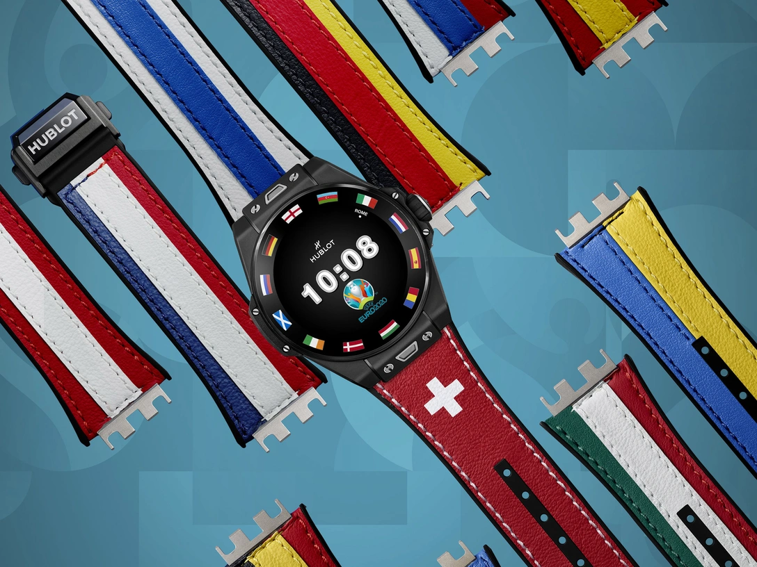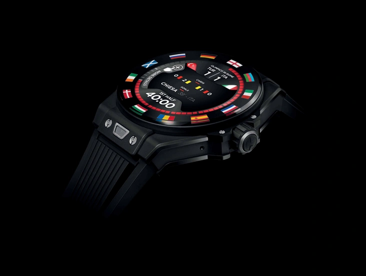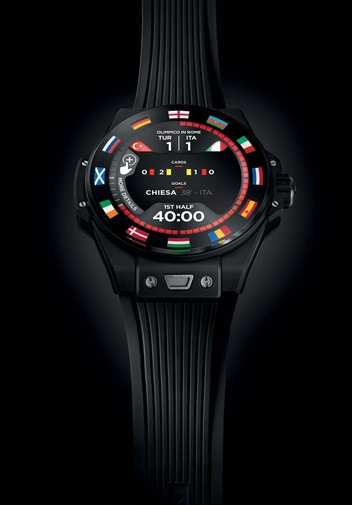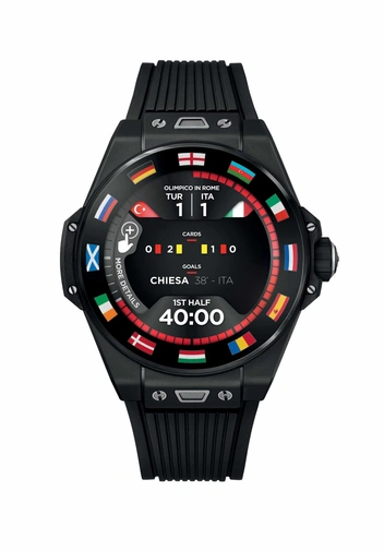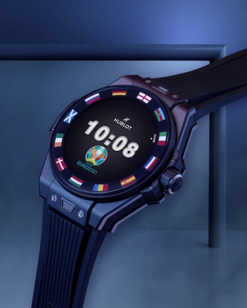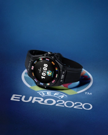 После годичной отсрочки во время пандемии чемпионат Европы UEFA EURO 2020 впервые в своей истории пройдет в 11 городах в 11 разных странах. Безель на часах Big Bang e украшает цвета флагов 12 стран, которые планировалось разместить. С эстетической точки зрения он обладает атрибутами культовой модели бренда Big Bang. Для большей эргономики часы доступны в корпусе диаметром 42 мм из эффектной полированной черной керамики Black Magic, разработанной техническими специалистами Hublot с водонепроницаемостью до 30 метров. Сапфировое стекло означает, что сенсорный экран высокой четкости AMOLED прост в использовании, в то время как, как и в механических часах, кнопка на вращающейся головке используется для активации часовых функций.