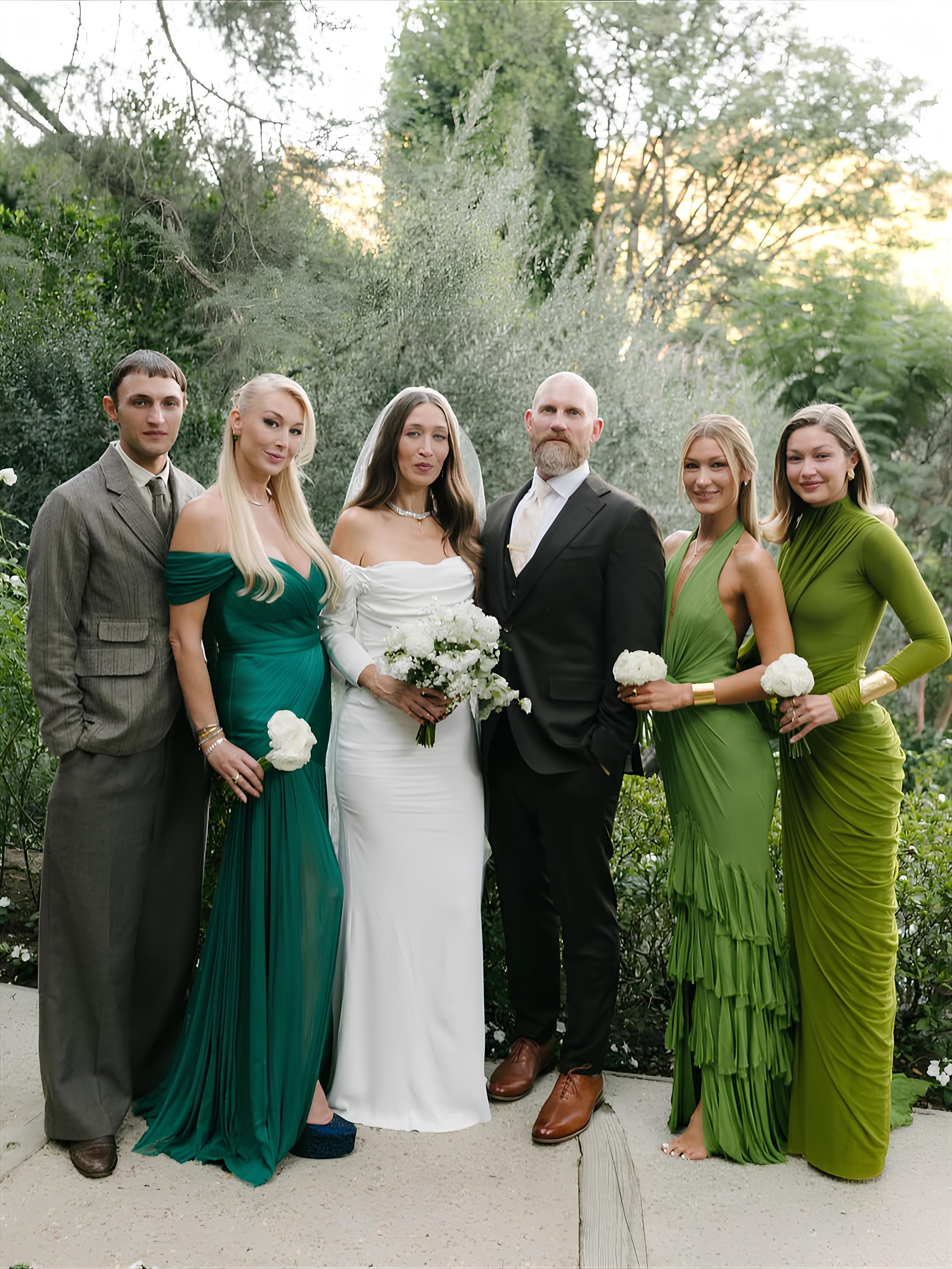 Что же касается гостей, то на свадьбе собрались самые близкие люди новоиспеченной семьи. От невесты прибыли уже упомянутые сестры Джиджи и Белла, а вместе с ними и младший брат Анвар. Модели были в драпированных зеленых платьях: с глубоким декольте и узлом на поясе у Беллы и с воротником-стойкой и длинными рукавами у Джиджи. Интересно, что как и невеста они ходили босиком — чтобы подчеркнуть непринужденную атмосферу и единение с природой.